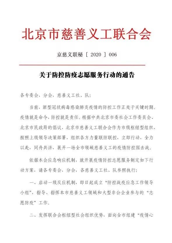 二级组织北京蓝天救援队共派出 210 余人次,在北京各个区域配合政府开展防疫工作;点滴常乐慈善义工服务队、京西慈善义工服务队等多支服务队选派人员,参加社区外来人员防疫检查,配合社区开展社区人员筛查活动,协助社区及村镇对进出车辆进行排查,提供体温测量等服务。乐邦会慈善义工服务队、橄榄绿慈善义工服务队、绿舟、红箭等各慈善义工服务队用清毒药水喷洒楼道及电梯、一层公共必经区、小区死角,防止疫情蔓延。绿满家园慈善义工服务队开展“绿满家园抗疫当前”行动,充分利用众多国家级心理专家和咨询师共同搭建的咨询平台,旨在以“家”为中心,推动人人“身”“心”双重健康,家家“室内”“室外”双绿的和谐幸福生活。